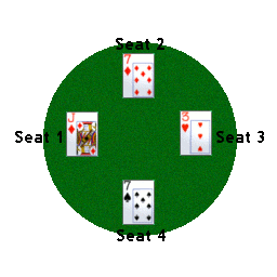 Goofy Rummy is a variation of that old favourite 'Rummy'. but with a few twists. Players familiar with Mah Jongg will also find many similiarities. I know many regular MJ players that now prefer goofy. The main twist to goofy, from that of regular rummy is the enforcement of very strict rules, with penalties for breaking those rules. Goofy also has it's own naming conventions, and specific terms that will be explained later in the terminology section. Now on the basic rules of gameplay. The game can be played with either 2,3 or 4 players. Two decks of cards are used and there are no jokers or wild cards present. A game consists of 7 hands, with the deal rotating clockwise. Each player receives 14 cards, with the player to the dealers left (the first one to act) getting 15 (this is to save time). The idea is easy, get rid of all your cards before any of the other players. The way to get rid of cards is to make 'spreads', that is either a sequential run of suited cards, ie. 7,8,9 of spades, or sets, which are 3 of a kind, but CANNOT be of the same suit. In order to start laying down cards, you must have 51 points. All cards are face value, with all face cards and aces being worth 10 points. There is one exception to this rule. If you lay down a Royal Flush ( 10 , J , Q, K , A of the same suit), that spread is worth 51 points by itself. Once you have gone down, you may now spike cards on other players spreads, assuming anyone else is down. Starting the game: ![]() In this example, two players plucked a 7 (suit is irrelevant). The player that plucked a 3 will get to choose which seat they would like to be in. So the order will go 3, 7, 7, J. Of course the 7's will have to re-pluck. Below is how it would work if the re-plucks were a 6 and 9, and the 3 had chosen seat 4. ![]() I hope this is self-explanatory. Once seats have been determined. The lowest card ( 3 in our case ) will begin to shuffle. Once shuffled, the cards are offered to player on the dealers' right. They are then cut. The bottom card from the half that is cut, is then flipped face up ( be careful not expose any other cards ). This card now becomes, the Blitz , or 'Wood' card. This card can be used by anyone, in turn to blitz the other players. The dealer now deals each player 14 cards, clockwise, beginning from the dealers' left. That player (to the dealers' left) gets a 15th card. The players now act in turn, plucking from the deck and discarding cards into the 'muck'. The player that has 15 cards DOES NOT pluck. If they do, it's a penalty and will result in that player 'taking a 100'. This will be explained in the penalties section. The idea now is to build your hand so that you have spreads (runs and sets) that equal 51 or more points. At this point you may lay down your hand. After each pluck, you must discard a card, so that a full hand always has 14 cards. If you notice a player that has not laid down, and does not have 14 cards, you may then tell that player to 'take a 100'. In other words, this is another penalty. Any penalty, or '100' will result in that hand being re-played with a new shuffle, but still counts as the same hand ( ie: if this were the 3rd hand of the 7 in a game, it still remains the 3rd hand). As I alluded to above, a full game of Goofy consists of 7 hands. It is possible to play more hands in a single game but that only occurs when someone fouls their hand, either by accident, or deliberately. After each hand is played, the deal rotates clockwise. If a hand must be replayed, the same player deals again. After someone goes out (gets rid of all their cards), the remaining players add up the points in their hand and informs the scorekeeper. Remember, all cards are face value. If someone gets caught with all of their cards, that simply counts as '100'. The person that got the out, gets 20 points taken off his or her score. Should the hand be a Blitz, the points are doubled. After the game is over, the points are added up and the person with lowest score wins. Assuming there are stakes involved, (it really is more fun to play for something) the game is paid out top down. What this means is that the person with the highest point total has to pay 3 each player that has a lower score than them. In a four player game that means the they would have to pay 3 people. 2nd high of course pays only 2 people and gets paid by one. This will be fully explained in the scoring section. For now, please proceed to the rules section to have all the rules, terms and penalties explained. |